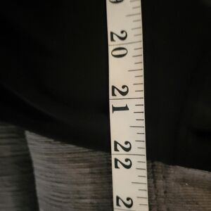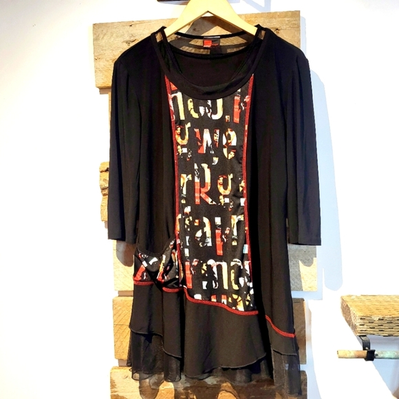 Stylish black tunic top with red accents and graphic design. Features a layered look with three-quarter sleeves.