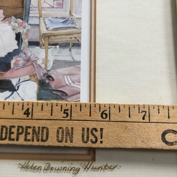 Lovely watercolour art print in a gold frame. Titled: The Attic. Features a child flipping through a book of what appears to be old photographs while a trunk of clothes sits open behind her.