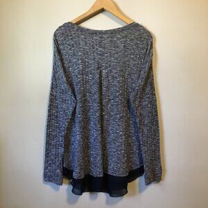 Very good preowned condition, long sleeve, bilayer (fabric insert sewn at the bottom, not lined), dark dark navy blue and white heathered, ribbed shirt by Denver Hayes. Made in Canada, this shirt has a box pleat in the back for a stylish look. Cute and flattering. The blue is very dark. Sometimes I'm not sure whether it is actually black, but it definitely has a blue tint.