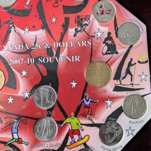 Commemorating the following sports: Ice Sledge Hockey, Ice Hockey, Speed skating, Bobsleigh, Figure skating, Freestyle Skiing, Snowboarding, Alpine Skiing, Biathlon, Wheelchair Curling, Hockey and Curling. There are also 3 quarters commemorating a Gold Medal in Men's Hockey, a Silver Medal in Biathlon and a Bronze Medal in Women's Hockey. Then there are 2 "Lucky Loonies" ($1 coin) commemorating the Olympics.