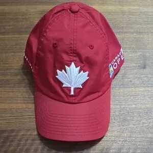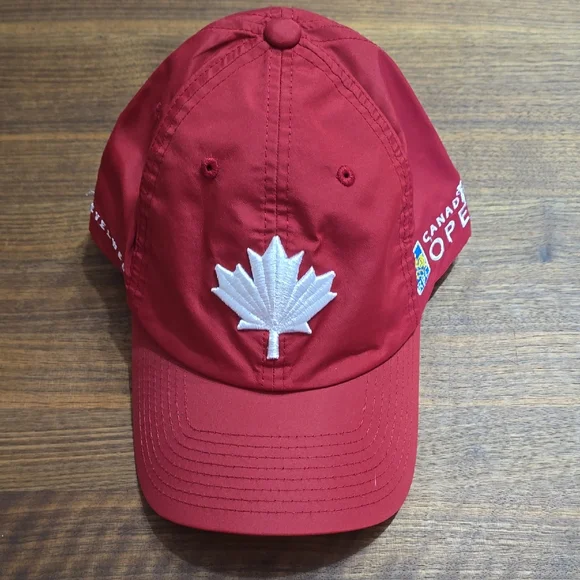 Stylish Canadian Open red baseball cap featuring a bold maple leaf design. Perfect for casual outings and showing your love for Canada.