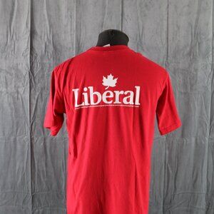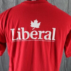Up for sale is a Canadian political shirt. It is for the Liberal party and it has a red base colour. The front of the shirt has choose forward screened on in white. The back fo the shirt has Liberal with a maple leaf above screened on in white. What a great shirt do not miss out on it.