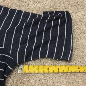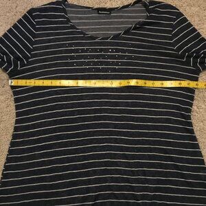 Very good preowned condition, dark black/grey with a tint of blue shirt with white horizontal pinstripes and half sleeves by Canadian company Initiatives. This shirt is so unique. With it's diamond rhinestones about the collar and buttons at the cuffs for rolling up, this piece emanates eclectic vibes. Rayon blend gives it a nice lightweight hang.