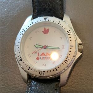 This stylish I Am Canadian men’s watch features a sleek silver case and a classic leather black strap. Perfect for any occasion, it combines elegance with functionality. Excellent condition, needs a new battery