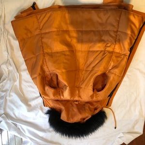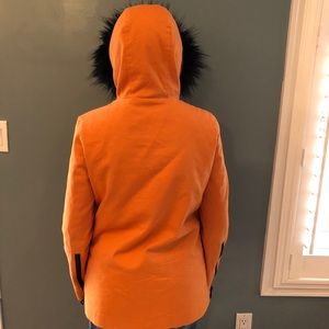 Rain slicker yellow with navy faux fur. Navy zippers. Insulated, removable vest inner lining. Two front pockets. Fur is removable. 98% cotton and 2% elastane.