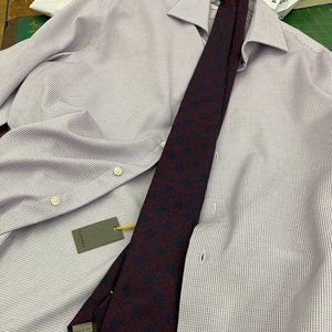 Pure silk tie with a two-tone geometric jacquard motif, which adds a dynamic touch. A must-have accessory for the businessman who likes to enhance his looks with personality and refinement.