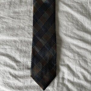 Beautiful striped pattern tie from Canali. Gold and dark blue plaid.