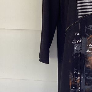 Black, orange, viscose spandex, round neck with zipper detail on front, 3/4 length sleeve, silver script graphic print, EUC, neck to hem 28”, armpit to armpit 19”, armpit to cuff 12”