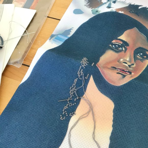 Counted Cross Stitch "Indian Maiden" Candamar Kit #50414 (1990). Kit is open and a few first stitches were worked, but kit is mostly unfinished with plenty left to complete. Finished size is 14"x18", matted size: 18" x 22".