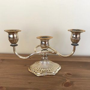 Vintage candelabra has elegant swirl arm shape with 3 holders for taper candles. Metal finish is pale gold color, with brass at the top of the candle holder. Approx. 6" tall x 11" wide x 4" deep. Has blue velvet on bottom of base. Pre-owned condition, metal finish has spots/wear, some wax residue. (Candles not included, for illustration only).
