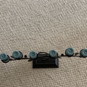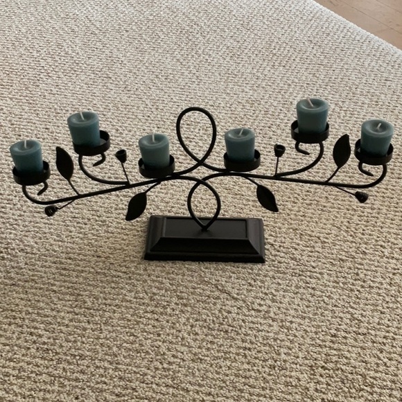 Black floral candelabra with 6 brand new blue candles included! Perfect for a living room or bedroom looking for a classic touch. About 17 inches long.