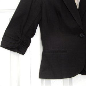 Candie’s black blazer is fitted at the waist for a very flattering and feminine look. This fully lined blazer has 3 quarter length sleeves with layered stitching. It also has ruffles in the lower back as per the last picture.