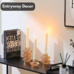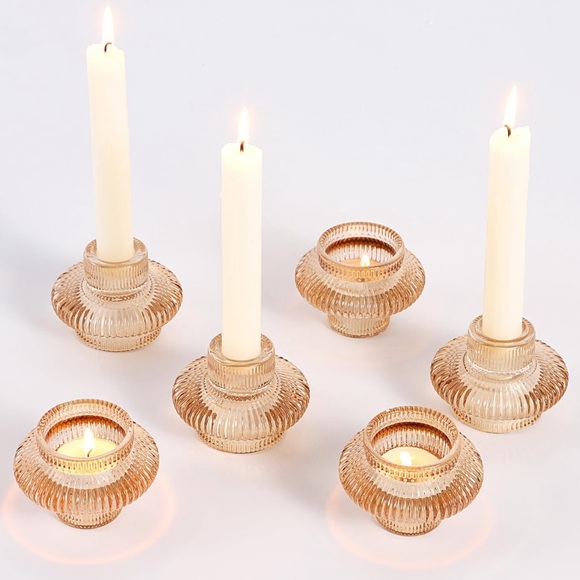 Beauty multi use candle holder. Fits tapered candle stick on one side, flip over to hold a tea light candle. Set of 6. Ribbed detail. Measures 3 1/4” at the widest part and 2 1/4” tall. Holders can stack together to create unique look or height.