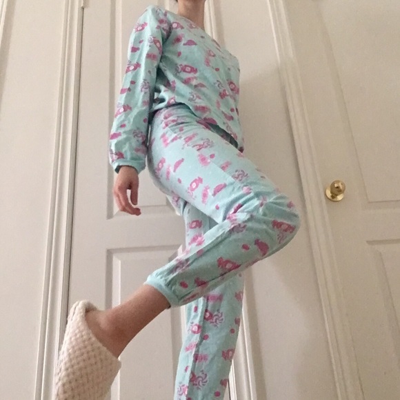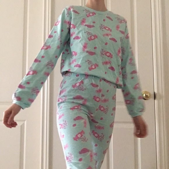 The CUTEST turquoise blue candy pyjamas with little pink candies scattered all over them!