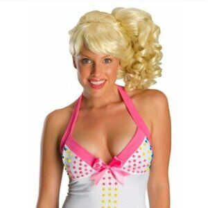 Includes dress with 3-D puff print and wide fishnet thigh leggings. Wig and shoes sold separately.
