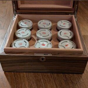 Nine container humidor includes nine glass quarter oz containers with airtight lids, vapor bead pack for humidity. Made of walnut and in great condition except for a few small scratches on top of the lid.