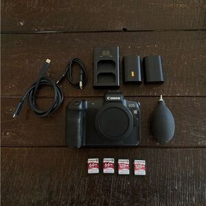 Comes with two Canon batteries, 4 SD Cards (64gb and 128gb), USB-C connect cord, double battery charger and cord, and lens dust blower.