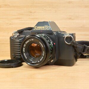 The Canon T70 is a reliable 35mm SLR film camera perfect for both beginners and collectors. This set includes the sharp Canon FD 50mm f/1.8 lens and a Canon 277T flash, offering everything you need to start shooting right away.