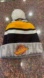Stylish Canucks beanie featuring black, yellow, and white stripes with a pom on top. Perfect for hockey fans.