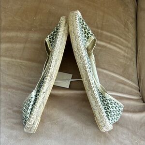Step out in style with these chic women's espadrilles. Featuring a green and gold design, these shoes offer comfort. Perfect for casual outings or a day at the beach. Vegan materials.