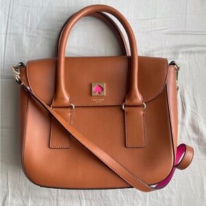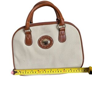 Neutral canvas satchel with brown faux leather trim and handles. Features two compartments for cards and phone. Classic, versatile everyday bag.