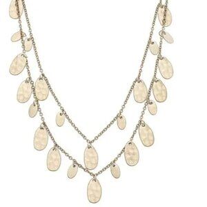 Stunning goldtone layered necklace enhanced with hammered oval accents.