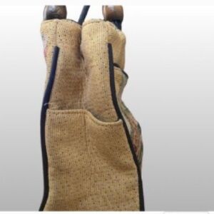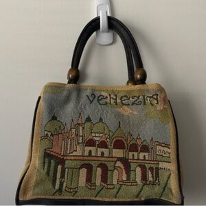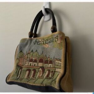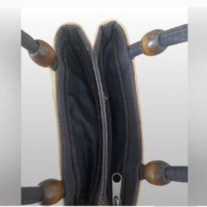 Not sure of the material but could be straw or nylon or canvas or very tightly woven linen or a blend of some or all of the above. Three compartments, two of them comes with zip closures. The zipper on the other one might have been broken off at some point. Side panel for small items to keep them within easy reach.