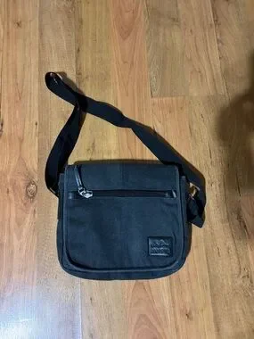 Compact black canvas messenger bag designed for everyday carry. Features an adjustable shoulder strap and front zip pocket for quick access. Durable canvas construction with a subtle patch logo. Simple, versatile style in black for daily use.
