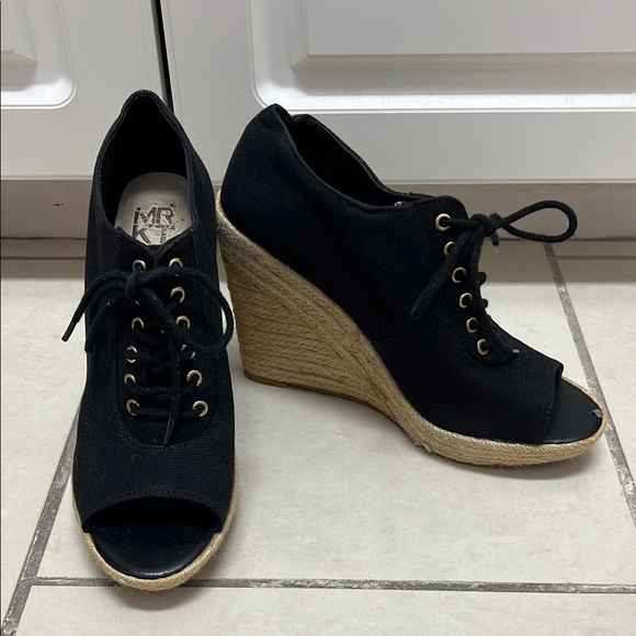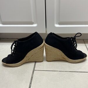 Canvas and Tweed Lace Up Open Toe Wedges | Size 7 Black
