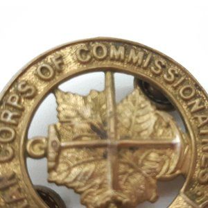 This is a Canadian Corps of Commissionaires cap badge or medal. It is 1 1/2" in diameter and is decorated with a maple leaf, a sword and anchor in the center.