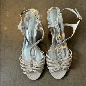 Like new, only worn once. Champagne and diamanté evening show in perfect condition. Size 9.5 B. Purchased at Macy’s