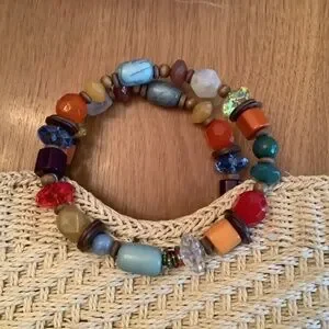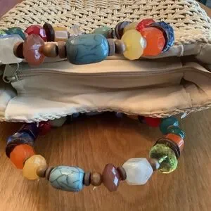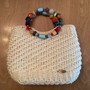 Beautiful rattan purse with beaded handles. Mint condition. Only used once for 2 hrs. Inside is enclosed with zipper and has pockets. Size - 12” length from top of handle to bottom of purse, 8.5” length purse only (not including handle), 11.5” width, 3.2” depth.