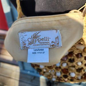 Beautiful pre-owned Cappelli Straworld handbag made of 100% paper. Inside nylon type material liner. One side has various type of bead type stones. 11 inches by 11.5 inches. Long attached strap which is 14 inches (total 28 inches) Clean interior. Great for winter getaways or summer. Beads glisten when hit by sun.