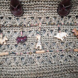 Front has miniature wood animal carvings hanging with beads