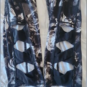 No size tag, I'm guessing they're a medium. Black/white/grey floral, with cut outs at the bottom of the legs.