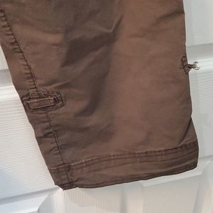 Brown capris. Size is missing. I'd guess an 8. Can be rolled up and buttoned or left a little longer. Each leg has one little tab that needs to be reattached, but no rips.