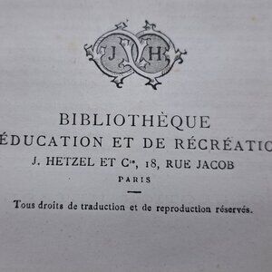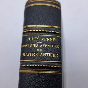 An antique book in French, Jules Verne's Captain Antifer (Mirifiques Aventures de maître Antifer). It is the 1st volume and the 3rd edition so it was most likely published in the late 1800s or very early 1900s (and definitely before the publisher was purchased in 1914). It was published by J. Hetzel & Co. in Paris. The binding seems to be in good shape and the pages are still white save for the blank pages at the beginning and end of the book.