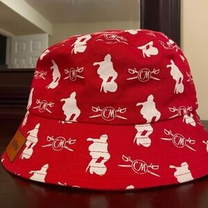 Stylish red bucket hat with white Captain Morgan logo pattern.