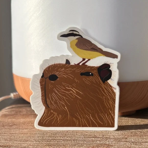Cute sticker featuring a capybara with a bird on its head. Perfect for decorating laptops, notebooks, or water bottles.
