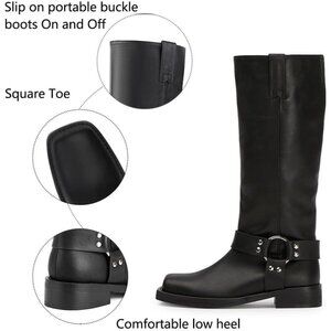 Caradise Women Black Knee High Square Toe Pull On Flat Motorcycle Comfort Boots