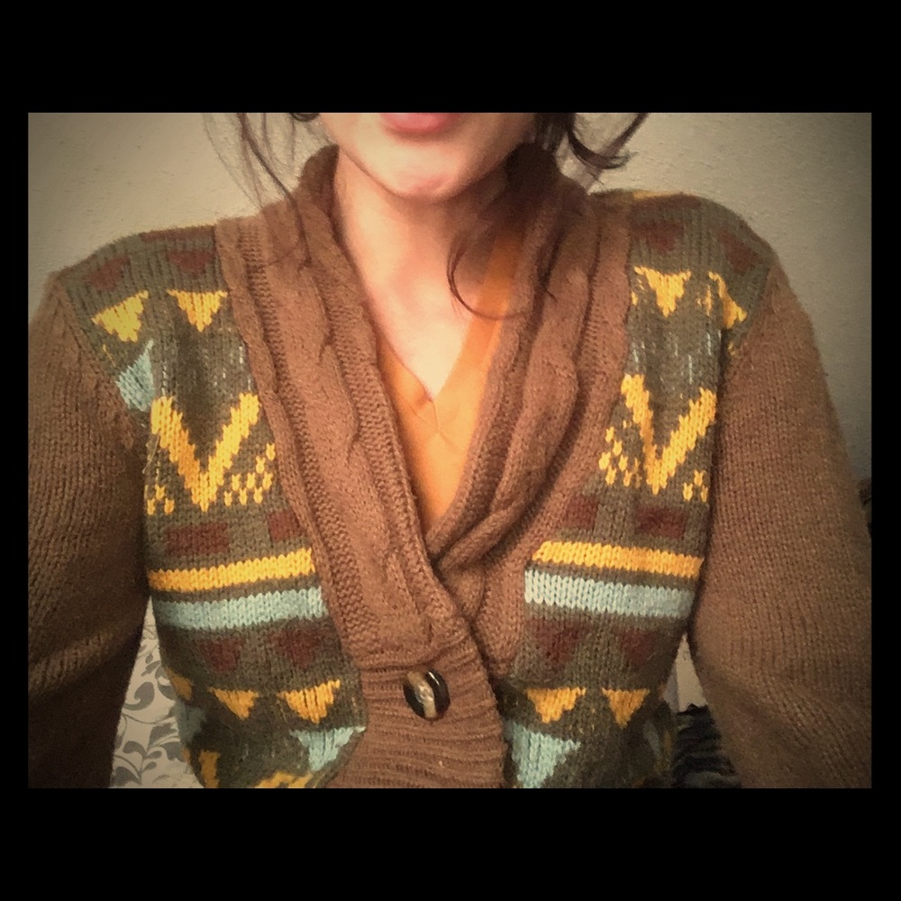 Brown, cotton/acrylic cardigan with aztec print on the front. Mostly brown but the aztec patterns follow earthy colours. (No pockets)
