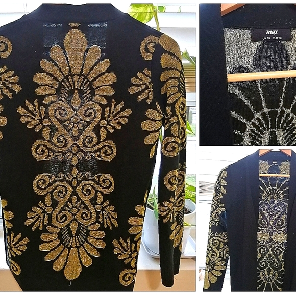 Black light weight cardigan with gold thread print on the back and the sleeves
