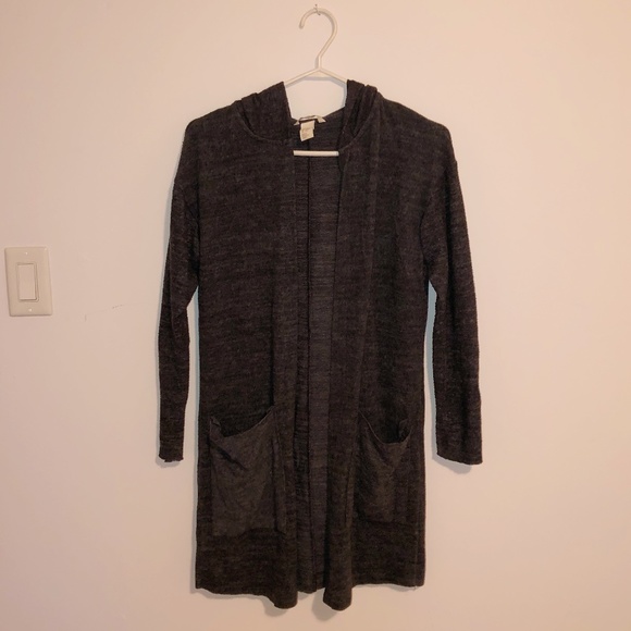 - Grey cardigan - Front pockets - Hood - Goes just below the knees - Fuzzy material on the outside