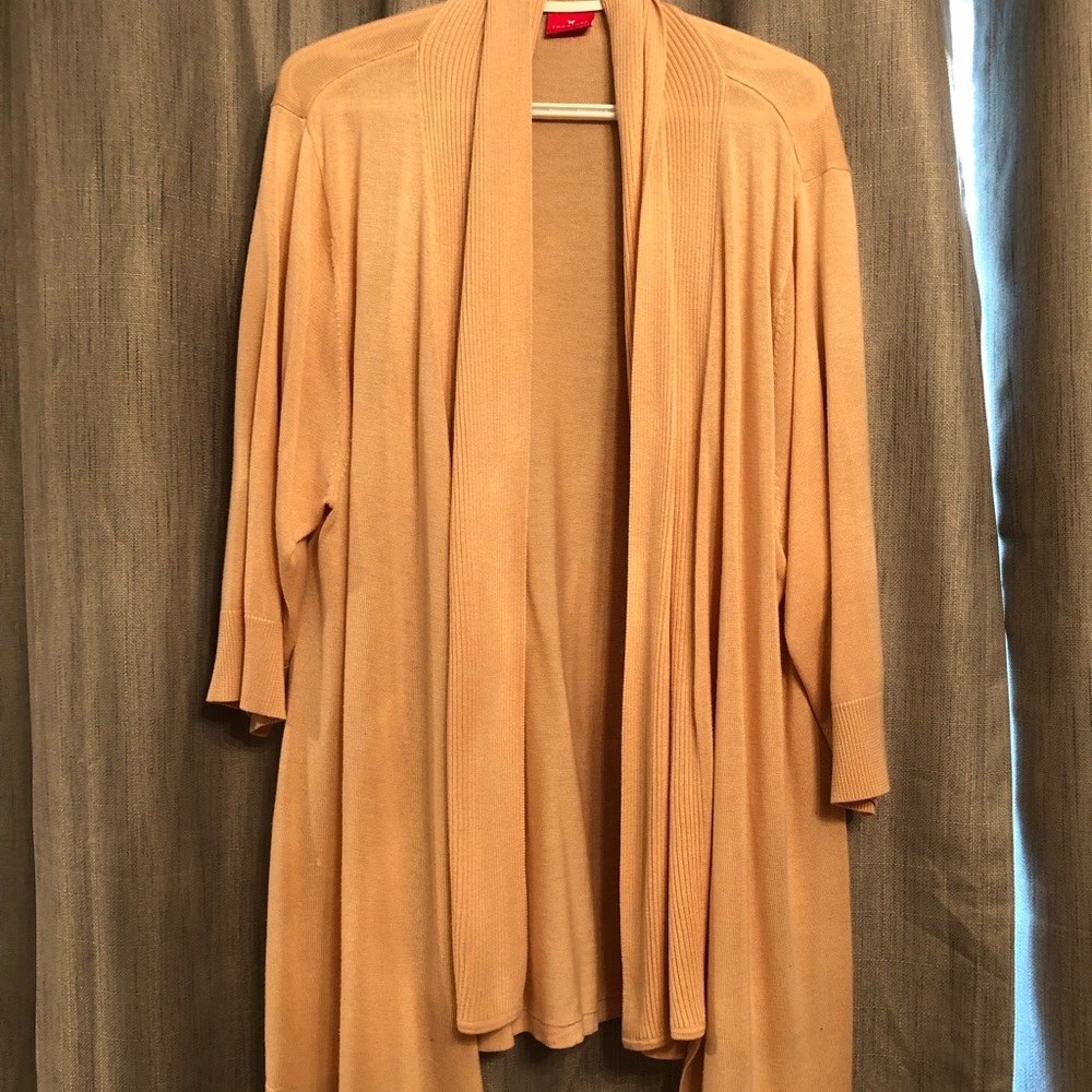 Large peach flowy cardigan. Pretty colour, super comfortable fabric, great condition. Sleeves are half or three-quarter. I am generally a size medium and I wear it as an oversized cardigan, probably a size L or XL.