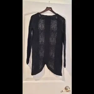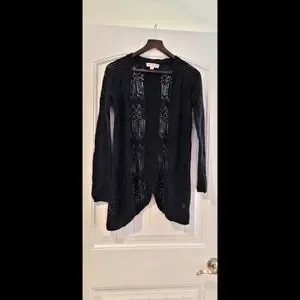 cute black lace style cardigan, falls about mid thigh on me and I'm 5'4