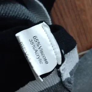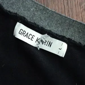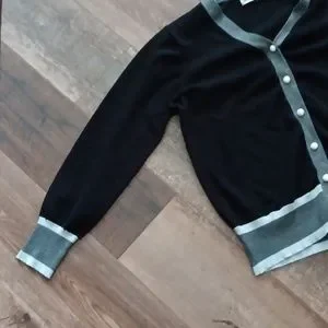 black cardigan with two-toned Grey hem and sleeves and faux pearl buttons
