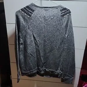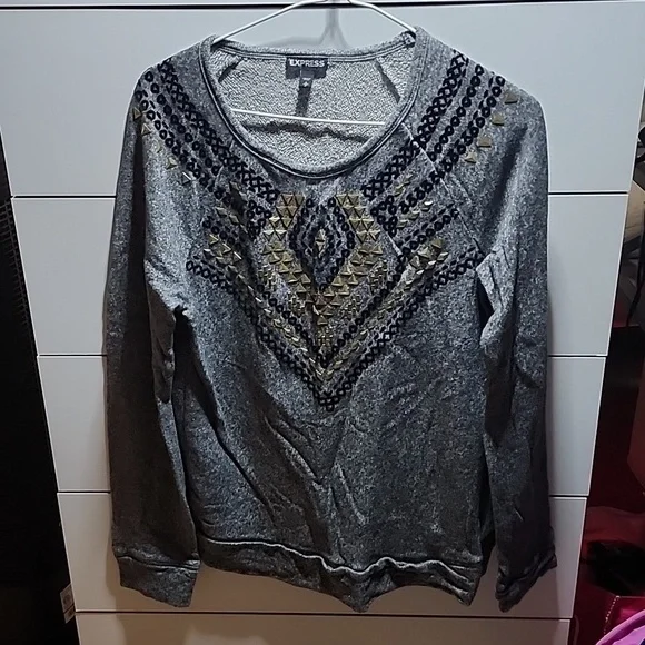 greay long sleeve sweat shirt with black emborried pattern and gold jewels.