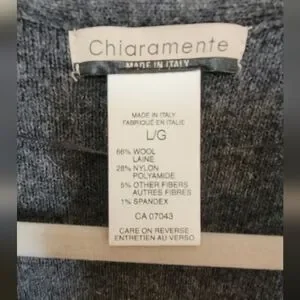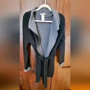 Shawl collar, belted cardigan. Made in Italy. Wool, nylon, spandex blend. Cuffed sleeves.
