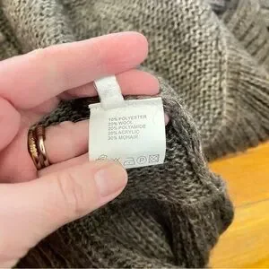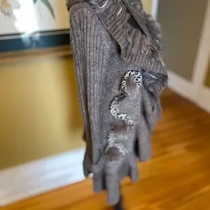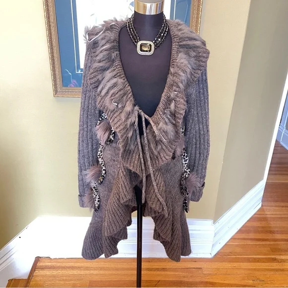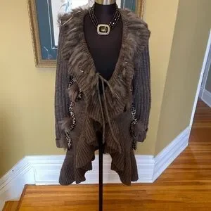 Beautiful neutral, toned cardigan sweater that is partially wool, acrylic, mohair, polyester. Beautiful embellishments. Marked size medium, and will fit a variety of sizes due to the open nature of the cardigan.