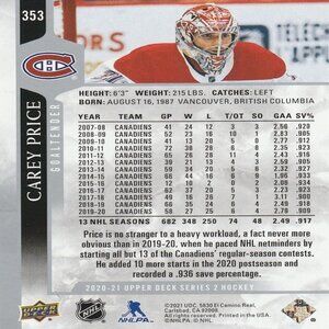 Carey Price - 2020/2021 Upper Deck Series 2 Hockey Card